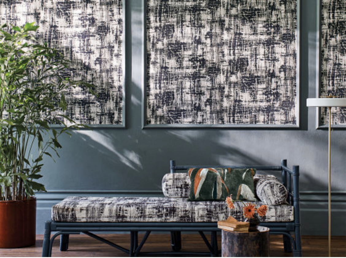 Abstract art, Jackson wallcovering features a rebellious, painterly design with unique textural qualities including an alluring velvet-like texture printed on a layer of fine lustrous yarns.